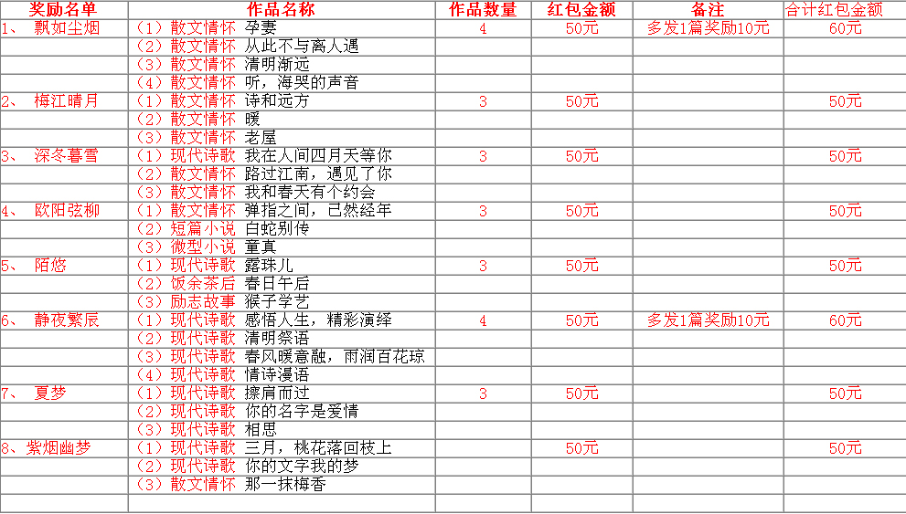 梅花文苑注册发三篇文章红包50元活动奖励名单